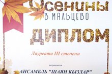 22 сентября 2018 года в Елабужском районе РТ состоялся всенародный конкурс-фестиваль «Осенины в Мальцево». Педагоги нашего коллектива, ансамбль «Шаян кызлар», в количестве 10 человек, выступили в номинации «Исполнительское искусство – «Задоринка» и получили диплом лауреатов 3 степени. ПОЗДРАВЛЯЕМ!