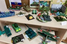 Выставка приурочена к празднику 23 февраля. На выставке представлена военная техника (вертолет, танки, самолет, бронемашины, корабли. Всё это ребята вместе с родителями мастерили своими руками из разных материалов.
