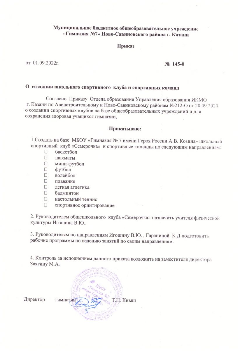 Приказ о создании спортивного клуба 2022г.