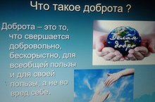 С самого раннего детства детям нужно объяснять, что такое добро. Дома родители на своем примере показывают детям, что такое добро. В школе же, учитель проводит специальные уроки, для того, чтобы побуждать детей на добрые поступки. Во время Урока добра учащиеся 6 класса рассказали, какие хорошие дела они успели сделать. Они отметили, все положительное, что приносит счастье, благополучие, пользу - есть добро.