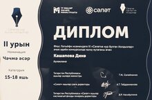 22 апреля в доме “Сәләт” объявили итоги республиканского конкурса «Сәләткә нур булган йолдызлар». Ученица 9 класса Кашапова Дина заняла II место в номинации «Проза».