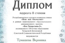 Ученица 5Г класса Тумашева Вероника стала лауреатом 2 степени в республиканском детском конкурсе стихов "Пою моё Отечество"