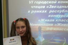 Сегодня ученица 5а класса Иванова Елизавета заняла 1 место в городском конкурсе юных чтецов "Звёзный билет" в рамках республиканского конкурса "Живая классика". Лиза прочитала отрывок из произведения А.П.Чехова "Каштанка" роль собаки Каштанки