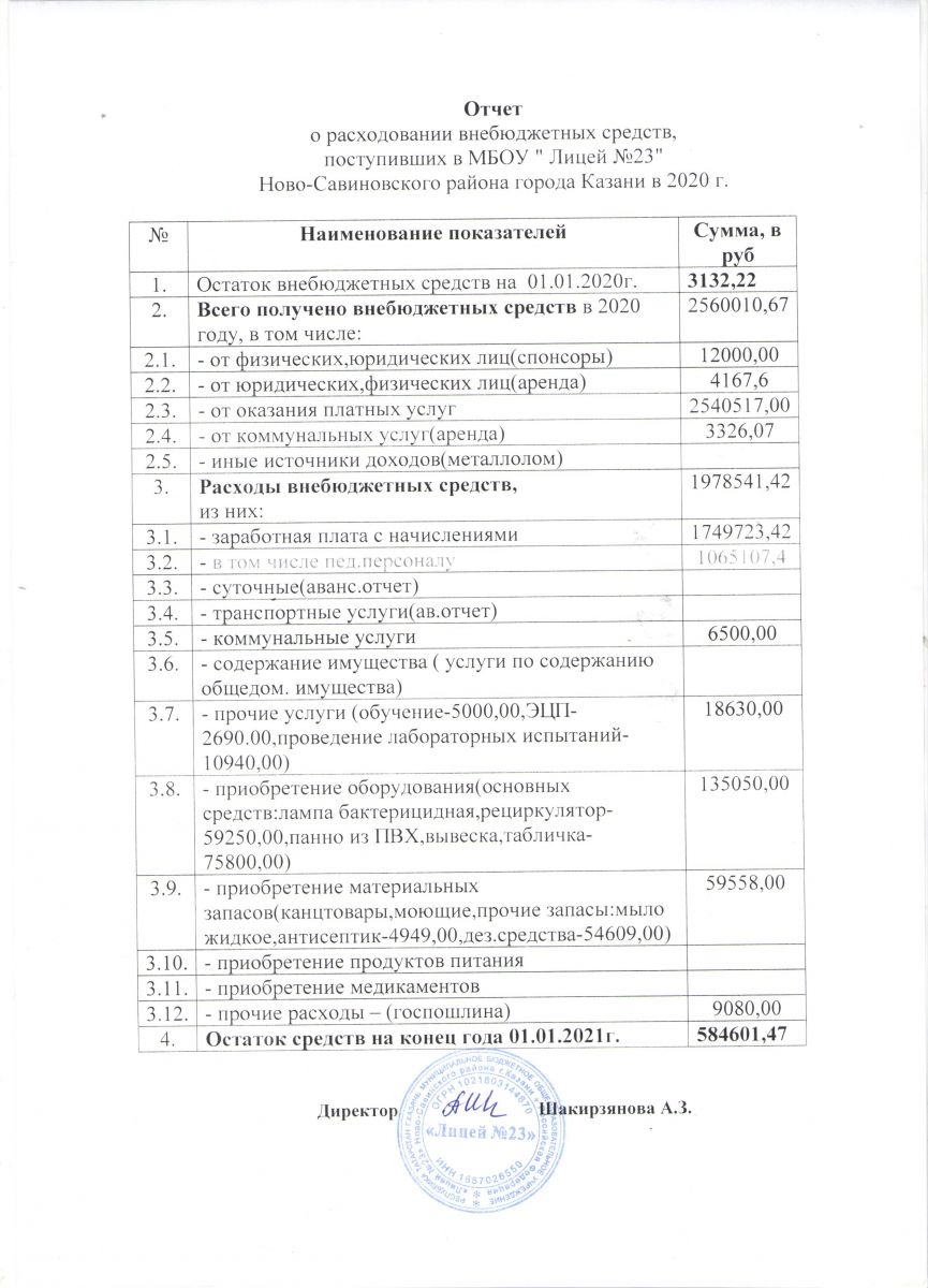 Отчет о привлечении и расходовании внебюджетных средств, поступивших в МБОУ "Лицей №23" в 2020 году