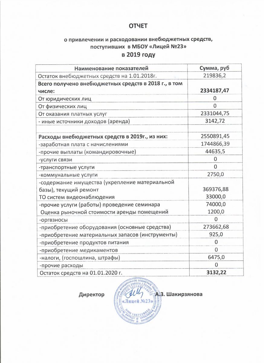 Отчет о привлечении и расходовании внебюджетных средств, поступивших в МБОУ "Лицей №23" в 2019 году