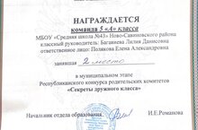 Елена Александровна поздравила классного руководителя Багавиеву Л.Д. и учеников 5 «А» класса с успешным выступлением в конкурсе «Секреты дружного класса». Ребята заняли почетное 2 место. Благодарность была выражена родителям, советнику директора по воспитанию и педагогу-организатору за поддержку и подготовку. Пожелаем ребятам дальнейших побед!