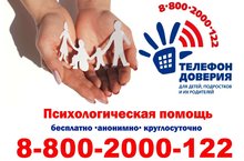 Телефон доверия для детей, подростков, родителей: тел. 8-800-2000-122 (круглосуточно)