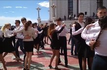 Под музыку победного майского вальса танцевали учащиеся 11А класса в рамках в акции "Вальс Победы" на площади. Акция проходила 9 мая и в ней приняли участие Нотфуллин Ф., Сираева Э., Мишина Е., Гибадуллин А.