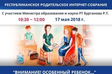 17 мая 2018 года состоится республиканское родительское интернет-собрание "Внимание! Особенный ребенок..." Обсуждение особенностей воспитания и обучения детей с ограниченными возможностями здоровья будет проходить с 10.30 до 12.00 на сайте киу.рф с участием министра образования и науки РТ Бурганова Р.Т..