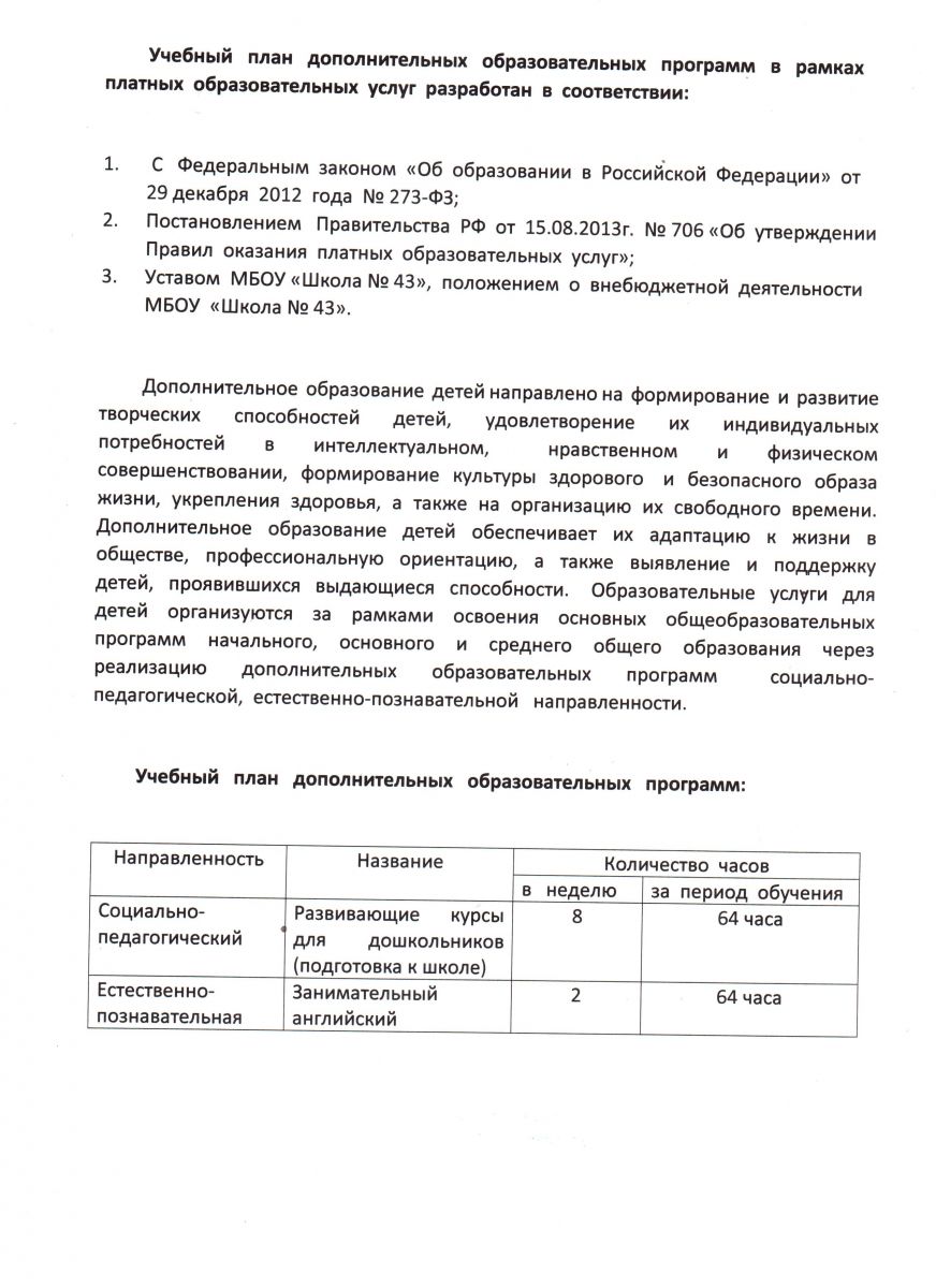 Учебный план дополнительных образовательных программ в рамках платных образовательных услуг