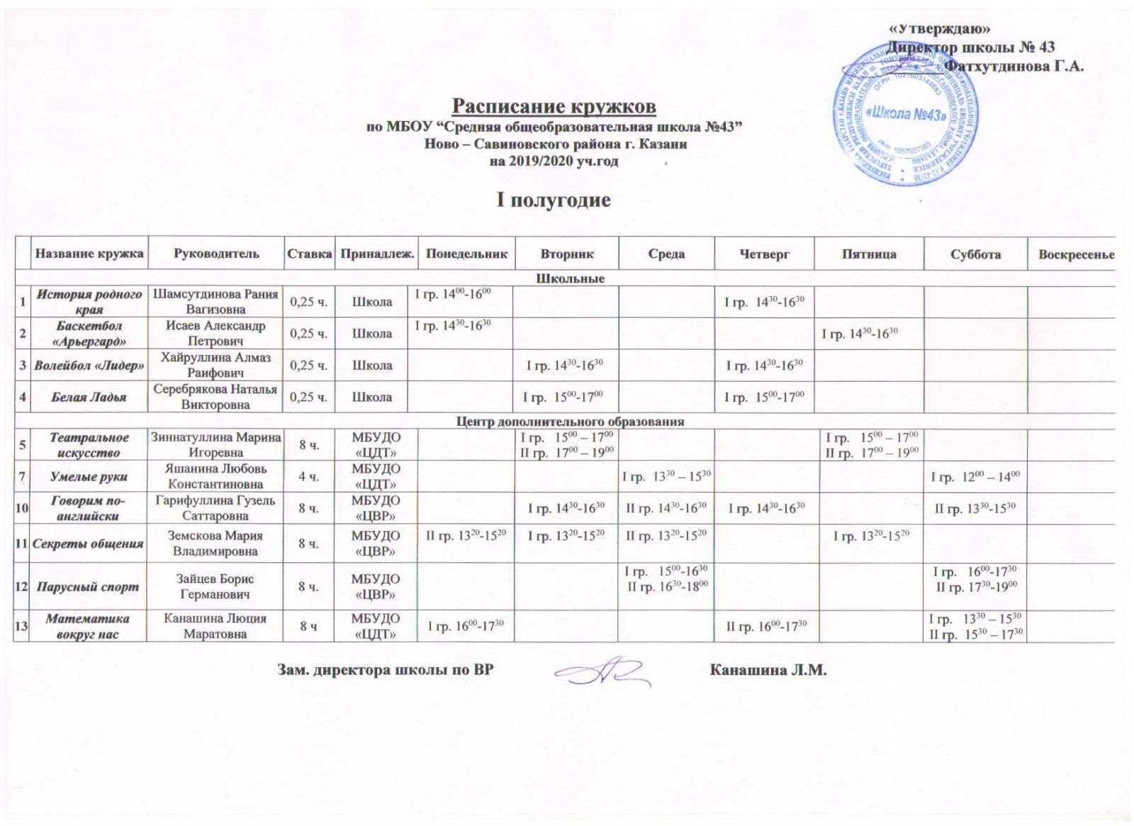 Расписание кружков на 2020-2021: 1 полугодие 2 полугодие