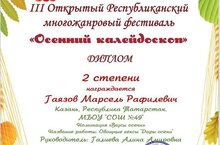Ученик 2Б класса, Гаязов Марсель, поучаствовал в республиканском многожанровом фестивале «Осенний калейдоскоп». В номинации «Вкусы Осени» Марсель стал дипломатом || степени.