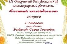 Ученица 4 В Богданова Софья приняла участие в 3 Открытом Республиканском многожанровом фестивале "Осенний калейдоскоп" и получила Диплом 2 степени в номинации "Я рисую Осень" .