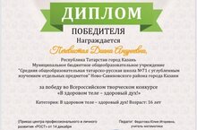 Печевистая Диана-10А сыйныф укучысы «Сәламәт тәндә сәламәт рух» темасына Бөтенроссия агитация плакатлары конкурсында җиңүче булды.