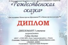 13 января ученик 5В класса Губин Богдан принял участие в IХ Международном фестивале-конкурсе детского и юношеского творчества "Рождественская сказка", прошедшем в ДК им.Ленина. В номинации: Театральное творчество. Художественное слово. "Младшая группа" Богдан стал дипломантом I степени.