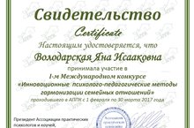 Педагог-психолог школы, Володарская Яна Исааковна, приняла участие в I-ом Международном Конкурсе Инновационных психолого-педагогических методов гармонизации семейных отношений.