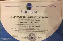 Поздравляем Зарипова И., ученика 9 класса, лауреата Всероссийского ежегодного конкурс научно-исследовательских, изобретательских и творческих работ Общероссийской Малой академии наук «Интеллект будущего" "Юность.Наука.Культура" . Работа Ильдара по созданию дистанционно управляемых малых летательных аппаратов получила высокую оценку жюри и стала лучшей работой в секции "Физика". Автор работы награждён почётной медалью и внесён в список одарённых детей Национальной образовательной программы «Интеллектуально-творческий потенциал России». Научный руководитель Булатова О.Г. -