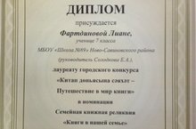 Фартдинова Л. , ученица 7класса стала лауреатом городского конкурса "Китап - доньясына сэяхэт - Путешествие в мир книги" в номинации Семейная книжная реликвия "Книги в нашей семье".