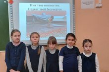 В 4а классе прошел классный час " Имя твое неизвестно, подвиг твой бессмертен". Цель классного часа: формирование чувства патриотизма, уважения к ветеранам Великой Отечественной войны, к истории России.