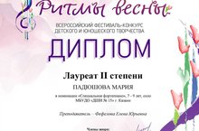 Поздравляем ученицу 1 Б класса Падюшову Марию, ставшую лауреатом 2 степени во Всероссийском фестивале-конкурсе детского и юношеского творчества"Ритмы весны" в номинации "Поэзия". Преподаватель: Фефелова Елена Юрьевна.