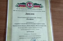 Ученики 4Б класса Андронов Алексей, Найдёнов Евгений, Садреева Алина, Хисамутдинова Камила, Шабан Никита, Шакирзянова Алия под руководством Галимовой В.Р., Мустафиной Р.Р. заняли 2 место в Республиканском творческом конкурсе"Ноосфера". Поздравляем!
