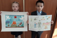 Ученики 2а класса Рыбалкина Полина и Ахметов Алмаз подготовили рисунки к районному конкурсу " Правнуки ветеранов рисуют Победу"