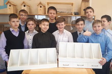 Мальчики 6 а класса на уроке технологии из пластиковых панелей собрали полку для тетрадей.