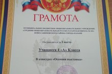 Ученики 4а класса награждены грамотой за 1 место. Участие в конкурсе "Осенняя выставка". Молодцы!