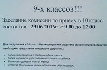 29 июня 2016 года с 9.00 работает комиссия по приему в 10-й класс: