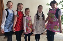 Посмотрите на нас. Эти фартуки мы сшили на уроках технологии. Вам понравилось?!