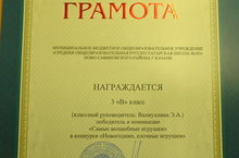 3 "В" класс (кл. рук. Валиуллина Э.А.) стал победителем в номинации "Самые волшебные игрушки" в конкурсе "Новогодние, елочные игрушки". Поздравляем!