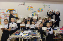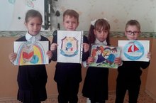 Ученики 1 А класса (кл.рук-ль:Гайнуллина А. М.) приняли участие в школьном конкурсе "Эмблема школы".