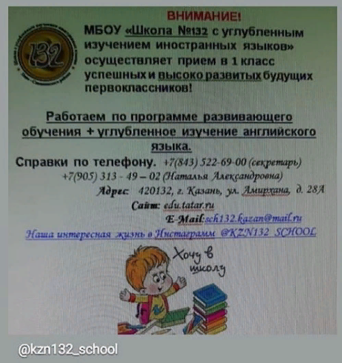 | E-Mail: | sch132.kazan@mail.ru S132.kzn@tatar.ru |