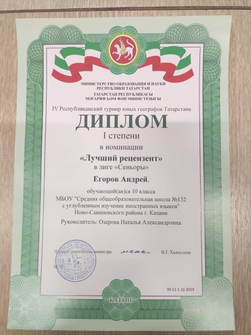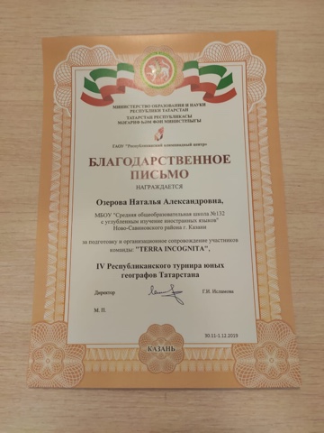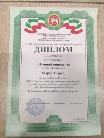 Команда "Terra incognita" вернулась с победой с lV Турнира юных географов Татарстана 2019 года. Егоров Андрей , 10а , стал победителем - лучшим рецензентом Турнира (Диплом l степени) и завоевал диплом ll степени в номинации "Лучший оппонент" в лиге "Сеньоры". Руководитель- Озерова Н. А.