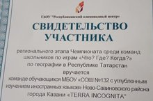 12 - 13.10.2019 на базе Республиканского олимпиадного центра "Дуслык" проходил региональный этап Чемионата среди команд школьников по играм Что? Где? Когда? по географии. Наша команда "Terra Incognita" (Антонова Валерия, Барченкова Екатерина, Егоров Андрей, Акбирова Диляра, Никулина Анастасия, Дягилева Дарья, Окружнов Илья, Абдулкина Софья) приняли активное участие, а в викторине, посвященной географическому наследию А.Гумбольта, заняли I место. Поздравляем наших учеников и руководителя Озерову Наталью Александровну!