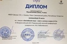 Ученица 4 Б класса Муллагалиева Злата приняла участие в III Всероссийской (XIX Поволжской) научной конференции учащихся имени Н.И.Лобачевского и в секции «Английский язык – ключ к успеху в науке(4-5) заняла III место. Умничка! Поздравляем!!!