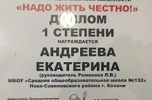 В Казани подвели итоги республиканского антикоррупционного конкурса "Надо жить честно". Поздравляем ученицу 8 Б класса Андрееву Екатерину (рук. - Романова Л.В.), которая была награждена дипломом 1 степени. Поздравляем!!!