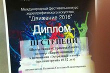 Поздравляем Светлану Владимировну Казакову и ее танцевальную школу "Стрекоза dance" (младшая и средняя группы) с дипломами II и III степени в Международном фестивале-конкурсе хореографического искусства "Движение 2016" в номинации "Эстрадный танец" Так держать! Молодцы!