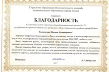 Управление образования Исполнительного клмитета муниципального образования города Казани выражает искреннюю благодарность директору Дергуновой .М. А. и всему коллективу школы за высокие образовательные результаты