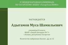Ученики 8 б класса Хасанов Даниф, Яруллин Руфим и Ясавиеф Юсуф, а также ученик 8 а класса Адыгамов Муса были удостоены дипломами I степени. Дипломами II степени удостоены ученики 9 а класса Махиянов Айбулат и Гиниятуллин Амир. Их тренер Мансуров Алмаз Ильдарович также награжден дипломом за подготовку участников. Поздравляем их с этим достижением. Желаем нашим ученикам дальнейших успехов и покорения новых вершин!