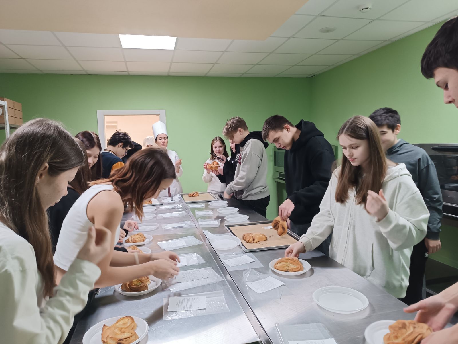 Опубликовано: 14.03.202513 марта учащиеся 9 Б класса 85 школы Казани посетили МКС. Экскурсия с мастер-классом "Мир профессий" познакомила школьников со специальностями колледжа. Они увидели наши лаборатории, познакомились с мастерами производственного обучения, которые им рассказали об особенностях их ремесла. Мастер - класс по работе с тестом и изготовлению булочек привел школьников в восторг, они с энтузиазмом формировали и декорировали свои хлебные произведения. Мастер Саттарова Айгуль Фаритовна не только научила их делать красивые булочки, но и продемонстрировала, как работает новая автоматизированная линия по производству хлебобулочных изделий в нашей новой лаборатории. Рассказала и показала школьникам какое современное оборудование используется для производства хлебобулочных изделий.