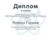 Дипломом II степени за победу в Международной онлайн-олимпиаде "Фоксфорда" по физике награжден лицеист 7А класса Роберт Гареев! Поздравляем! Выражаем благодарность учителю Диляре Альбертовне.