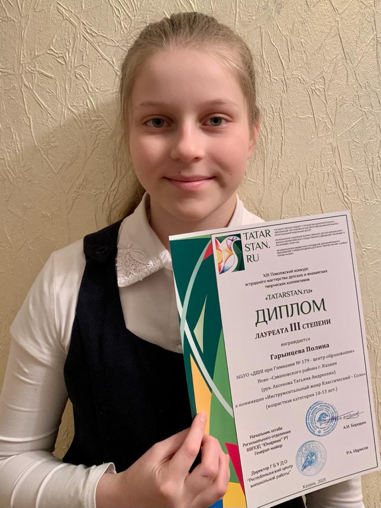 Поздравляем Гарынцеву Полину со званием лауреата lll степени Поволжского конкурса "Tatarstan.ru"