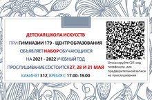 Детская школа искусств при Гимназии 179 - центр образования объявляет набор обучающихся на 2021 - 2022 учебный год. Прослушивание состоится 2 и 3 сентября в кабинете 312, время с 17.00-19.00. Подготовить 2 песенки и стихотворение. При себе иметь копию свидетельства о рождении и паспорт.