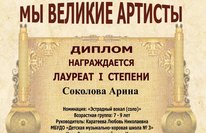 Поздравляем Лауреата I степени III Международного фестиваль-конкурса детского, юношеского и взрослого творчества "Мы великие артисты" Соколову Арину и ее преподавателя Каратееву Любовь Николаевну! Желаем Вам дальнейших творческих побед!