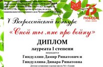 Поздравляем Лауреатов I степени Всероссийского конкурса "Спой ты мне про войну" Гиндуллину Динару и Гиндуллина Дамира, класс преподавателя Караратеевой Любовь Николаевны.