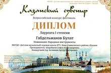 Поздравляем с успешным выступлением на I Всероссийском конкурсе-фестивале "Казанский сувенир" Лауреата I степени – Габдельманова Булата.
