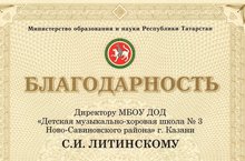Министерство образования и науки Республики Татарстан выражает благодарность Директору Литинскому Сергею Ивановичу за педагогическое мастерство , большой вклад в воспитание обучающихся и создание условий для развития дополнительного образований детей в Репсублике Татарстан, и преподавателю Гайнуллину Альберту Рауфовичу за активное участие и высокий профессионализм в торжественном чествовании лучших учителей Республики Татарстан в рамках празднования Дня учителя - 2015.