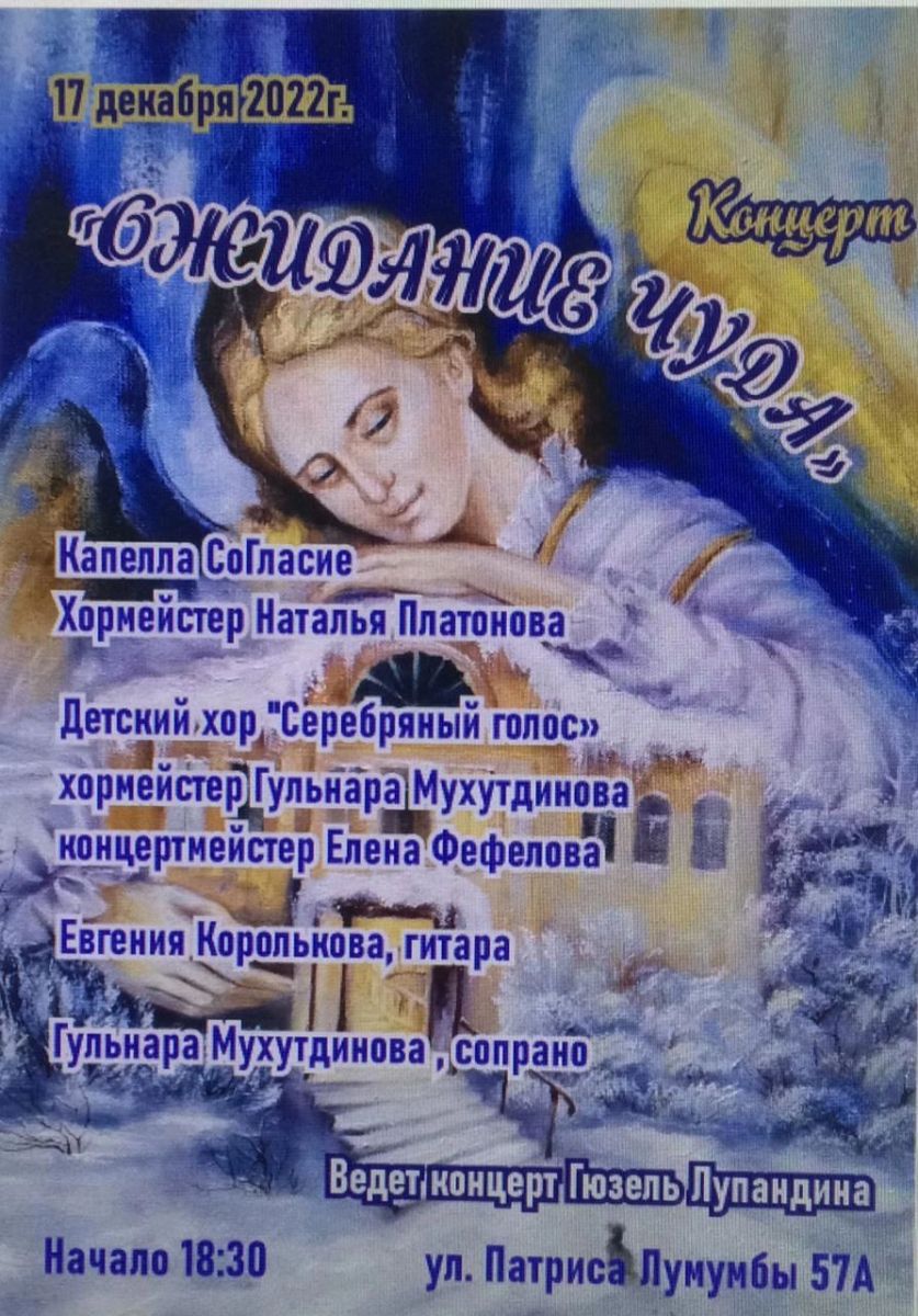 17 декабря преподаватели и ученики Детской музыкальной школы №11 Ново-Савиновского района приняли участие в концерте вокально-хоровой музыки «Ожидание чуда».Концерт состоялся в Евангелическо-Лютеранской церкви св. апостола Андрея, в нём прозвучала музыка XVIII-XX веков. Произведения для голоса и фортепиано исполнили преподаватели Г.Р. Мухутдинова (сопрано) и Е.Ю. Фефелова (фортепиано); а детскую музыку современных композиторов представил хор учащихся 1 класса «Серебряный голос» (руководитель – Г.Р. Мухутдинова).
