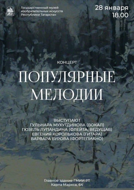 28 января в музее Изобразительного искусства Республики Татарстан прозвучат популярные произведения отечественных и зарубежных авторов в исполнении наших преподавателей Г. Р. Мухутдиновой (вокал) и Г.Б. Лупандиной (флейта, ведение программы).